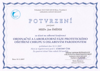 Ordinační a laboratorní fáze protetického ošetření chrupu s oslabeným parodontem, Brno, 10.11.2007, certifikát