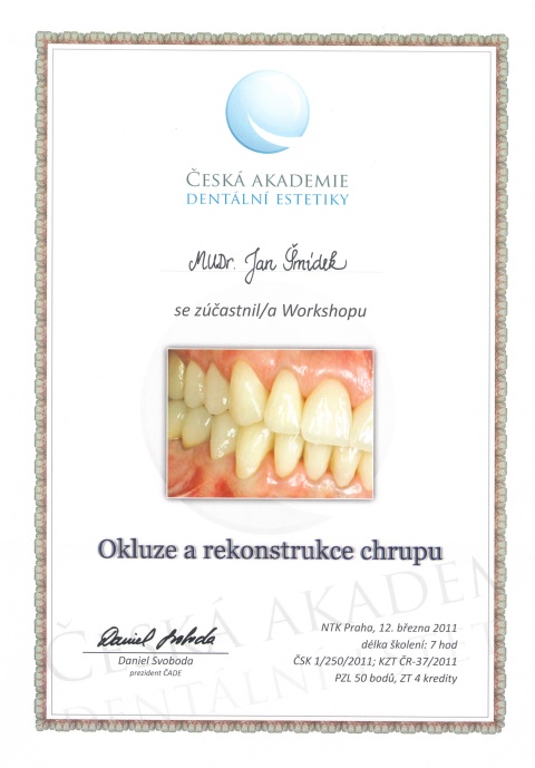 Okluze a rekonstrukce chrupu - open workshop ČADE, Praha, 12.3.2011, certifikát