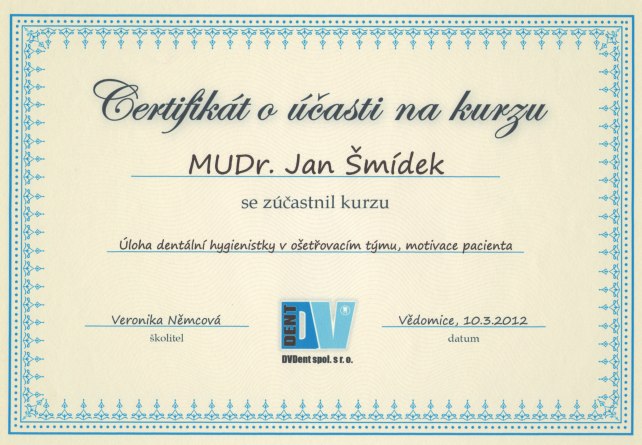 Úloha dentální hygienistky v ošetřovacím týmu, motivace pacienta, Vědomice, 10.3.2012, certifikát