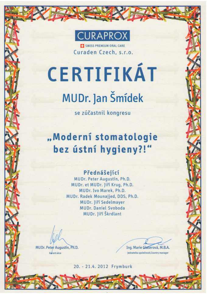 Moderní stomatologie bez ústní hygieny?!, Frymburk. 20.-21.4.2012, certifikát