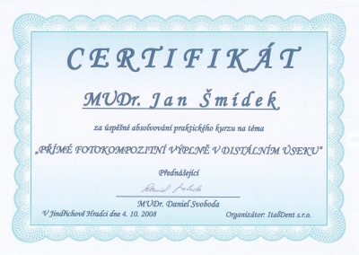 Přímé fotokompozitní výplně v distálním úseku, Jindřichův Hradec, 4.10.2008, certifikát
