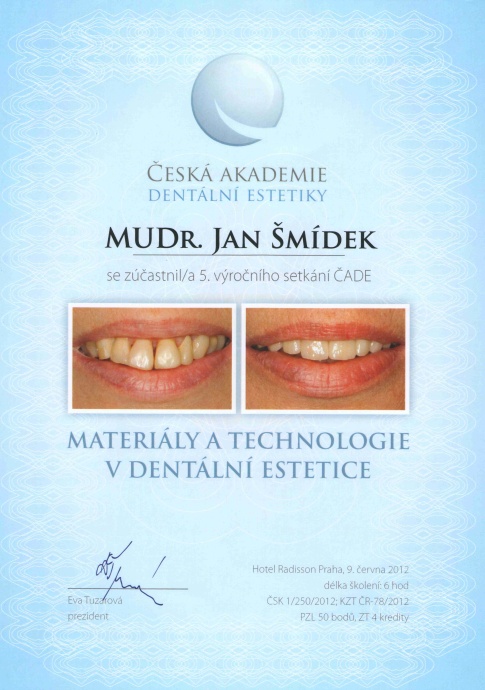 5.výroční kongres ČADE - materiály a technologie v dentální estetice, Praha, 9.6.2012, certifikát