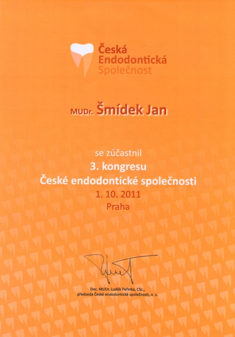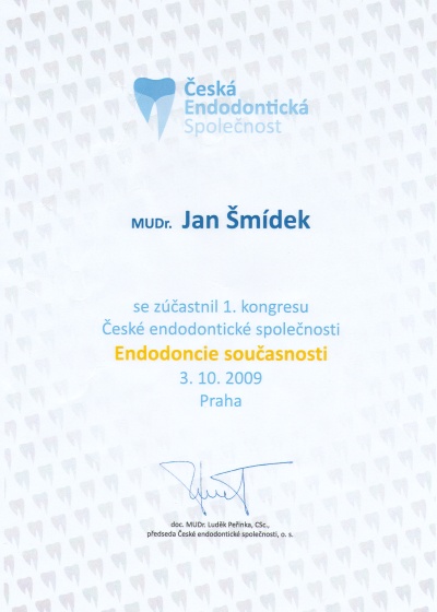 1.výroční kongres ČES - Endodoncie současnosti, Praha, 3.10.2009, certifikát