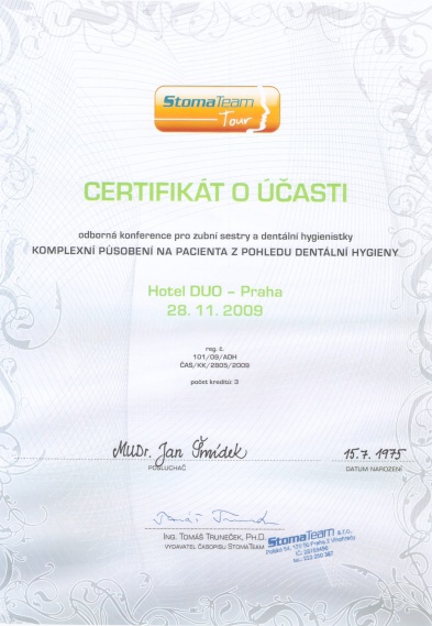 Komplexní působení na pacienta z pohledu dentální hygieny, Praha, 28.11.2009, certifikát