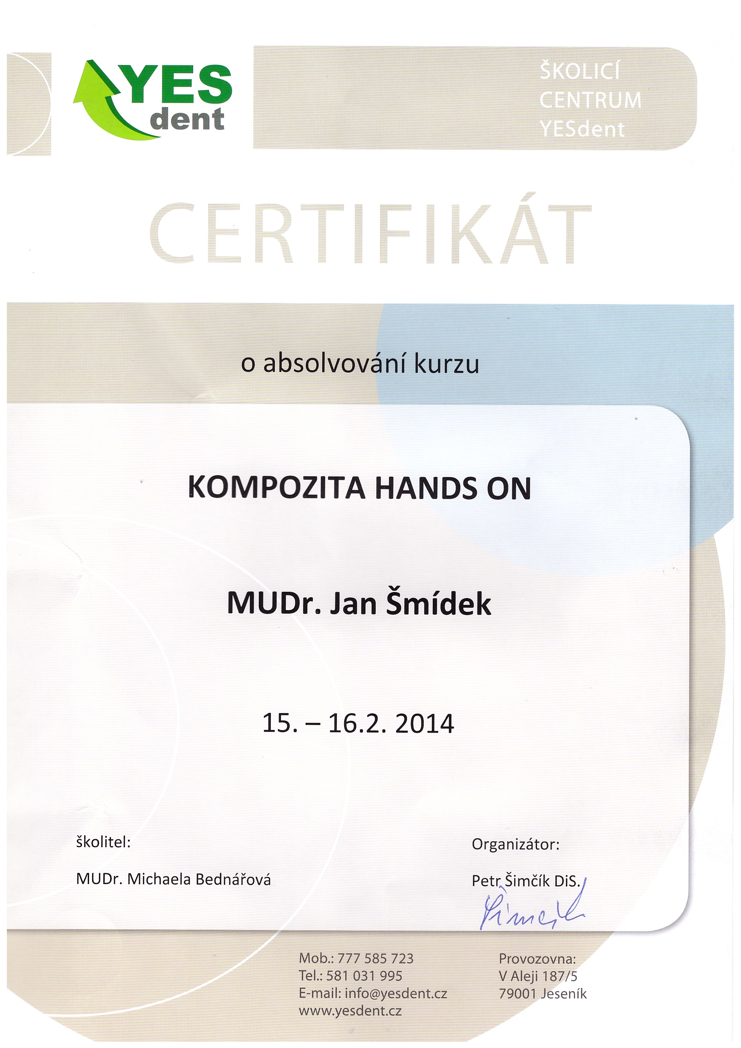 Kompozita Hands on, Yesdent, Jeseník, 15.-16.2.2014, certifikát