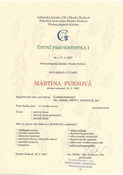 Ústní preventistka I, Hradec Králové, 26.-27.6.2007, certifikát