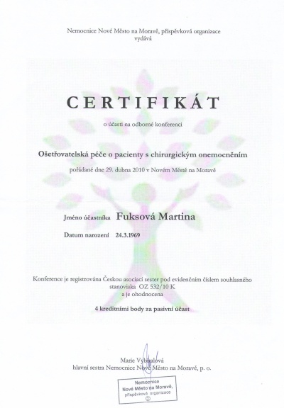Ošetřovatelská péče o pacienty s chirurgickým onemocněním, Nové Město na Moravě, 29.4.2010, certifikát