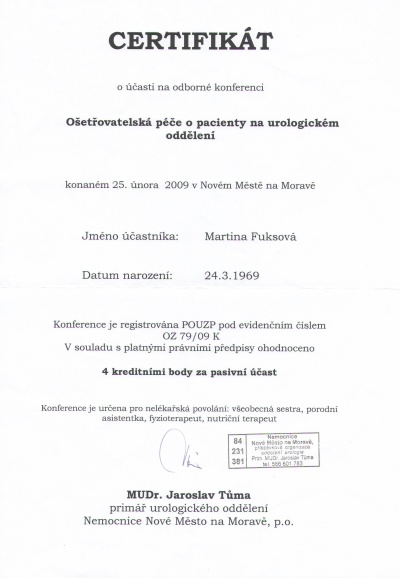 Ošetřovatelská péče o pacienty na urologickém oddělení, Nové Město na Moravě, 25.2.2009, certifikát