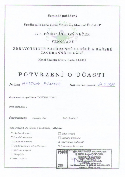277.přednáškový večer ČLS JEP, Skalský dvůr, 2.4.2010, certifikát