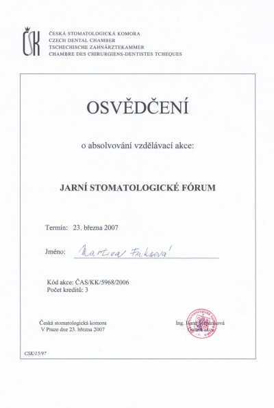 Jarní stomatologické forum, Praha, 23.3.2007, certifikát