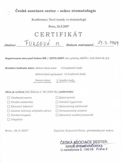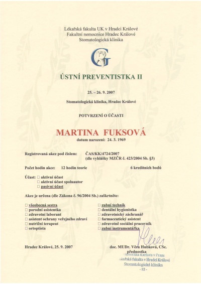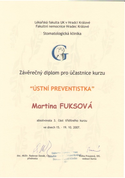 Ústní preventistka III, Hradec Králové, 15.-19.10.2007, certifikát