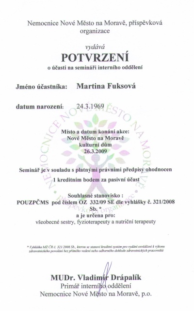 Seminář interního oddělení, Nové Město na Moravě, 26.3.2009, certifikát
