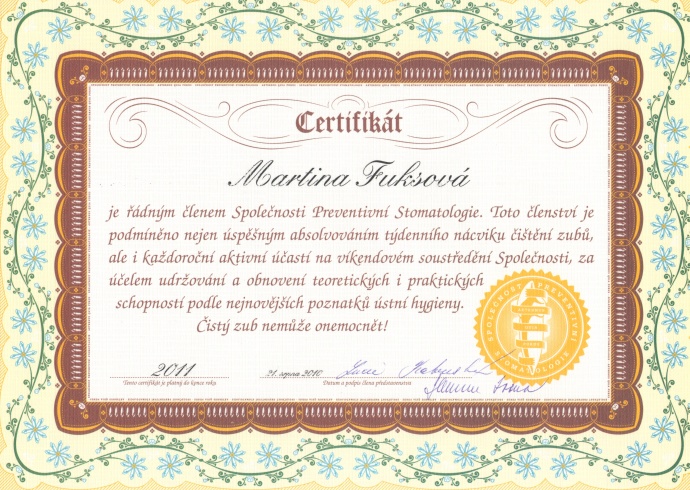 Obnovení členství ve Společnosti preventivní stomatologie, certifikát
