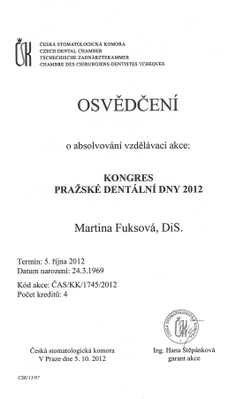 Praské dentální dny, Praha, 5.10.2012, certifikát