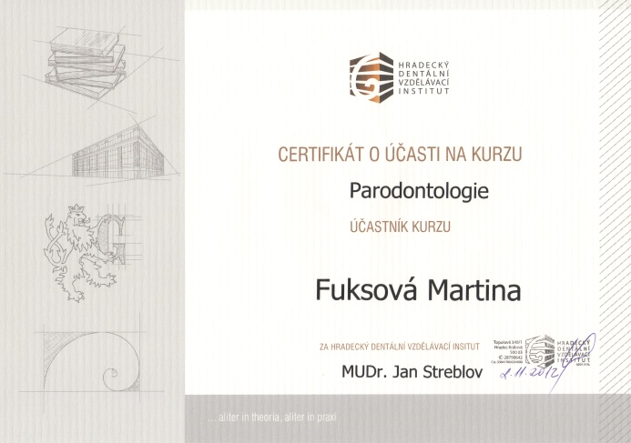 Parodontologie, HDVI, Hradec Králové, 2.11.2012, certifikát