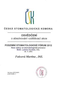 Podzimní stomatologické forum, ČSK, Brno, 30.11.2012, certifikát