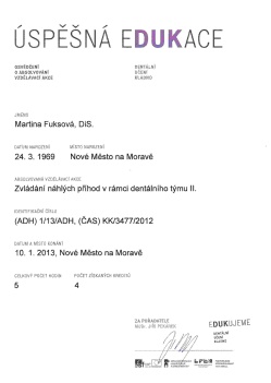 Zvládání náhlých příhod v rámci dentálního týmu II, DUK, Nové Město na Moravě, 10.1.2013, certifikát