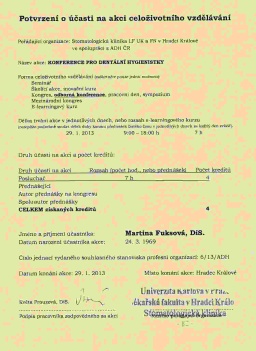 Konference pro dentální hygienistky, LF HK, Hradec Králové, 29.1.2013, certifikát