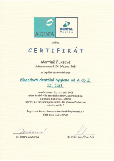 Víkendová hygiena od A do Z II, Boskovice, 20.-21.9.2008, certifikát
