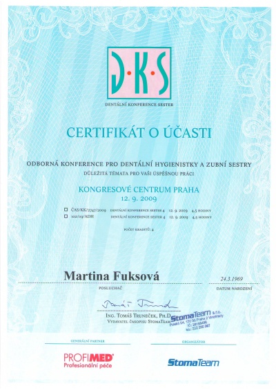 Odborná konference pro dentální hygienistky a zubní sestry, Praha, 12.9.2009, certifikát