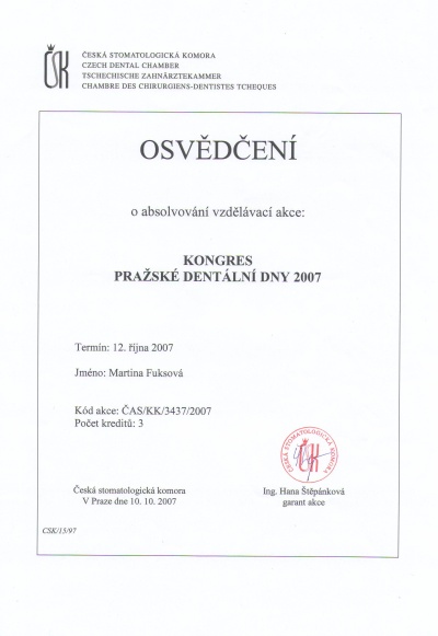 Praské dentální dny 2007, Praha, 12.10.2007, certifikát