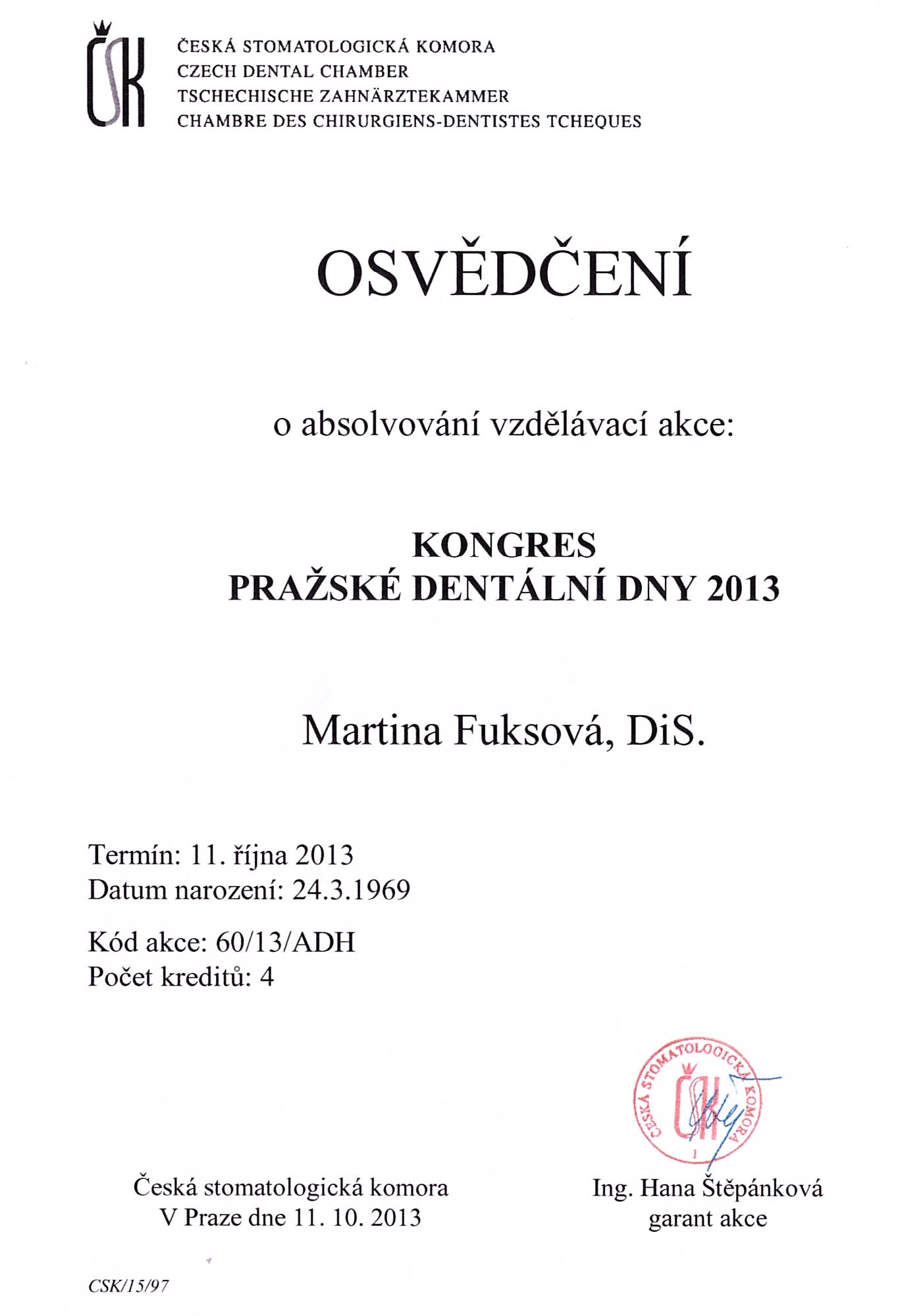 Praské dentální dny, Praha, 11.10.2013, certifikát