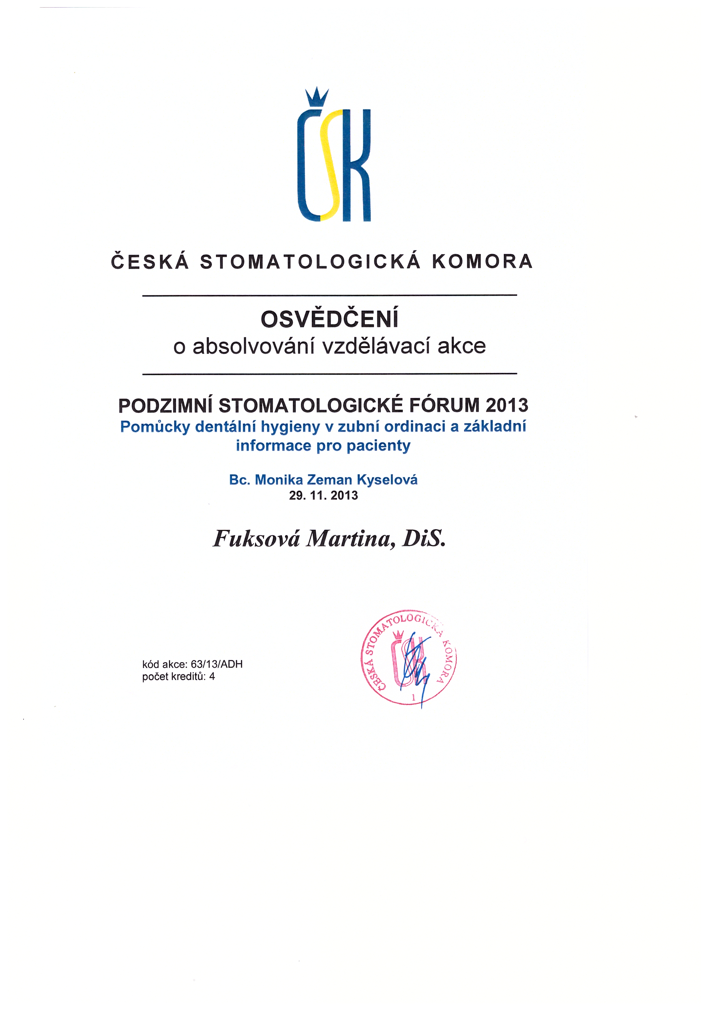 Podzimní stomatologické fórum, ČSK, Brno, 29.11.2013, certifikát