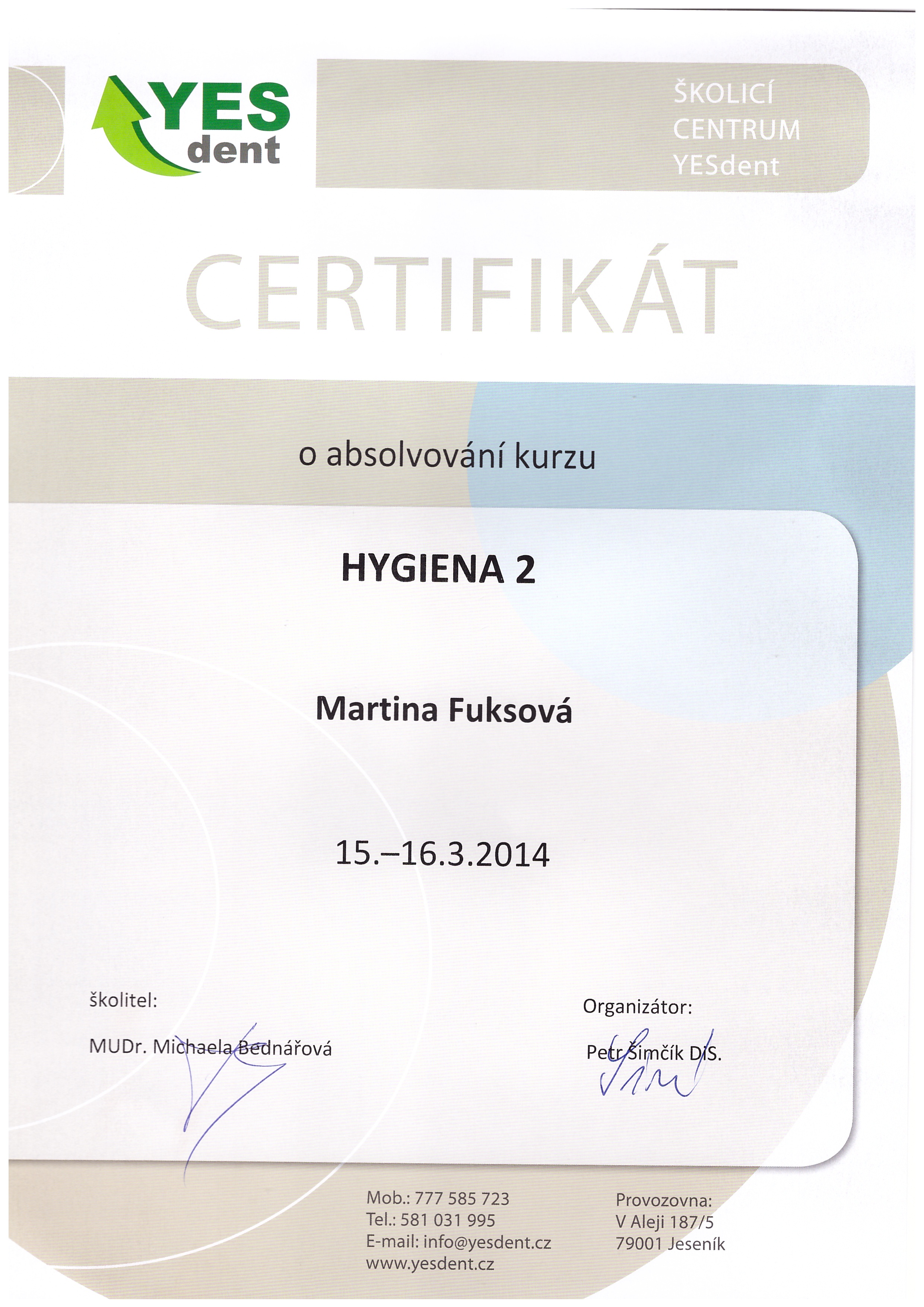 Hygiena II., Yesdent, Jeseník, 15.-16.3.2014, certifikát